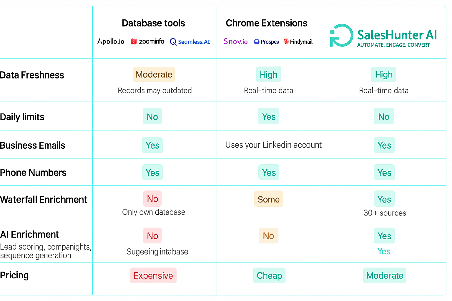 SalesHunter AI uses a real-time, multi-source waterfall enrichment system to deliver the most complete contact and company data – verified emails, phone numbers, job titles, and firmographics. If one data source fails, another takes over instantly — ensuring 95%+ match rates for your B2B lead generation and automated prospecting workflows.